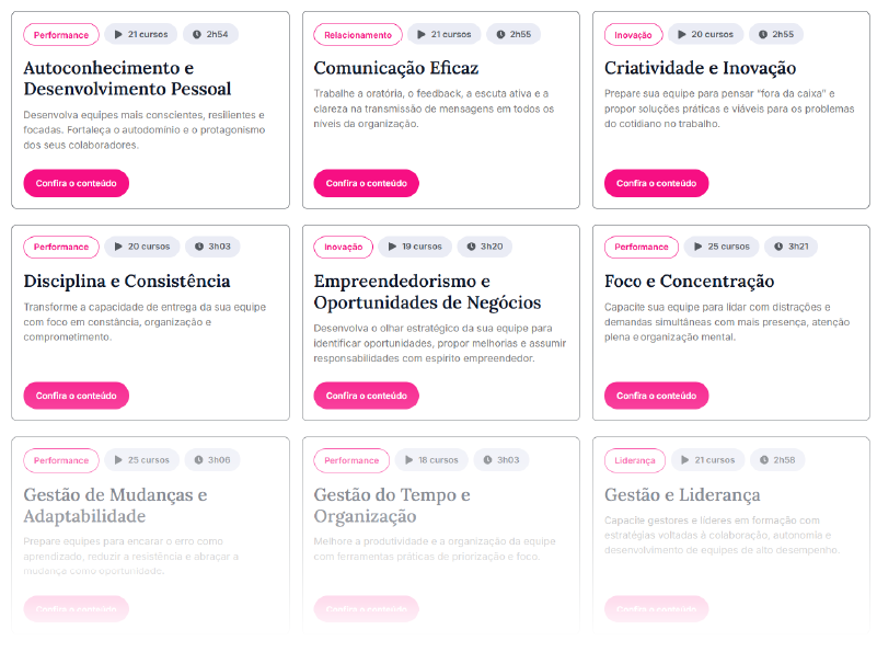 Cada módulo combina conteúdo atualizado, aplicabilidade imediata e formatos variados. Prontos para transformar o potencial da sua equipe em resultados concretos.