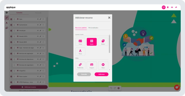 Crie facilmente treinamentos e cursos corporativos interativos com infográficos, atividades, vídeos e ilustrações. Ganhe autonomia na atualização dos seus conteúdos.